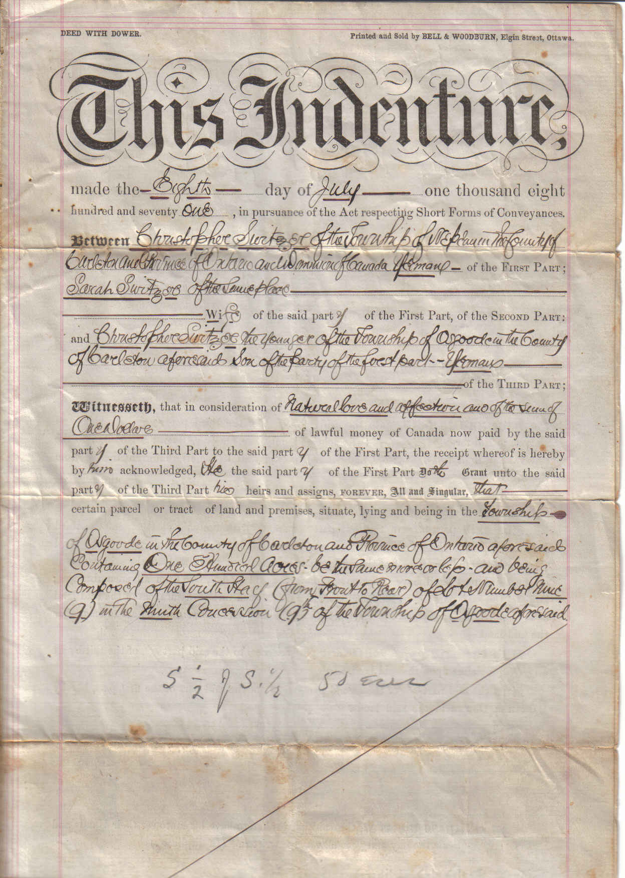 David OttawaThe Switzer Farm is located in the former Township of Osgoode, Ontario. Osgoode Township is now part of the City of Ottawa. It takes approximately 30 minutes to travel to the farm from the Centre of the City of Ottawa (approximately 36 km trip). The farm originally comprised 100 acres (1000 sq. chains) and was 100 chains long by 10 chains wide (1.25 miles by 220 yards) going from the 9th Line Concession Road on the west to the 10th Line Concession Road (Yorks Corners Rd.) on the east. The North Branch of the Castor River meanders through the middle of the farm which leaves 37.5 acres east of the Castor. The farm house (now taken down) and the barns were situated on a hill which divides the farm in the middle laterally which means that the buildings are over a half a mile from each concession road. Lanes were constructed from the buildings to the concession roads. The east lane starts out dividing the farm longitudinally until it reaches the castor. It then crosses through a bush of approximately 17 acres diagonally coming out of the bush on the north side of the farm and then reaches the 10th Line on that side of the farm. The road on the west starts out going west down the middle of the farm and then moves diagonally to the south side of the farm. It continues down this side of the farm until it reaches the 9th Line Road. In the early years of the farm, most of the farm traffic was on the eastern lane as the church, Knox United Church, the school, no 21, the cheese factory and the villages of Edwards (general store, Orange Lodge and train station for the New York Central) and Kenmore were the main destinations on the 10 line. Eventually with the usage of motor vehicles, the traffic pattern changed and the western lane became the most used road, with the village of Metcalfe the main destination. As the farm is no longer inhabited, the eastern lane is overgrown.